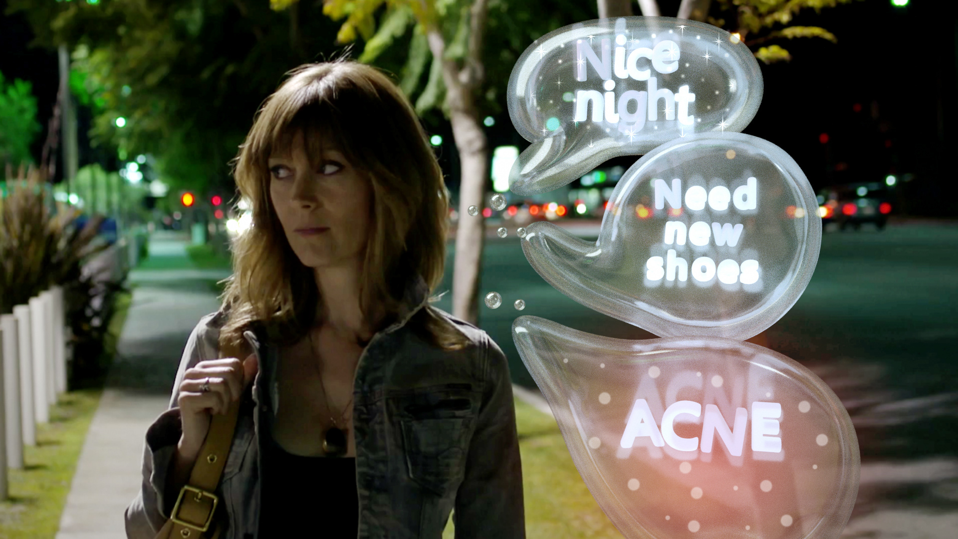 As part of our pitch for an Aczone campaign, we were asked to explore different looks for thought bubbles that show the inner monologue of a woman that always has her Acne on her mind. These are a few of my favorite looks.